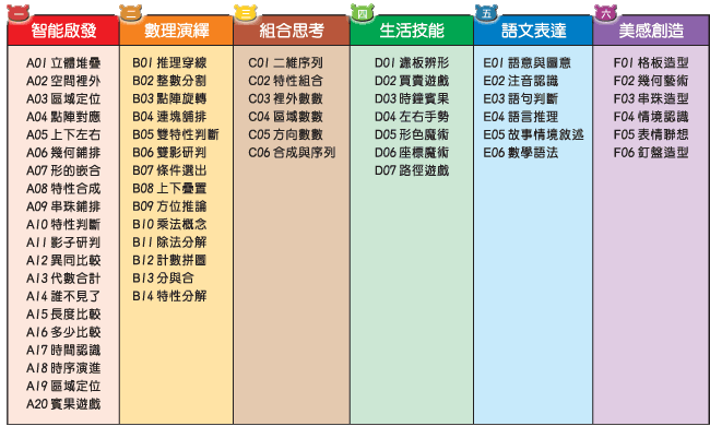 全系统长程规划教学,超学科、跨领域,「59 项子目录」科学排序的学习内容,「450盒脑力开发」统合式的完全操作。