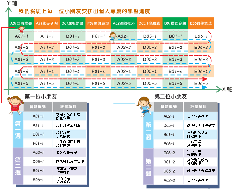第一阶段为59 项子目录单向排序(纵轴),第二阶段为螺旋式二度排序(横轴)。更藉由精心设计的学习进度手册,让教师在上课时完全掌握个别进度,不会发生重复学习或进度重叠的状况。